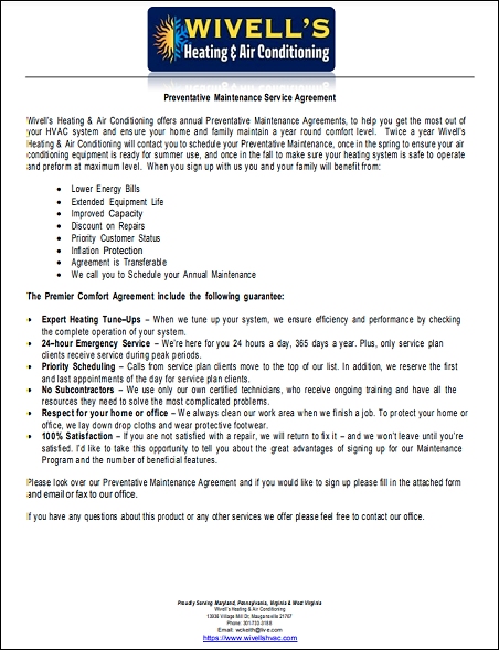 Wivell’s Heating & Air Conditioning offers annual Preventative Maintenance Agreements, to help you get the most out of your HVAC system and ensure your home and family maintain a year round comfort level. Twice a year Wivell’s Heating & Air Conditioning will contact you to schedule your Preventative Maintenance, once in the spring to ensure your air conditioning equipment is ready for summer use, and once in the fall to make sure your heating system is safe to operate and preform at maximum level. When you sign up with us you and your family will benefit from: